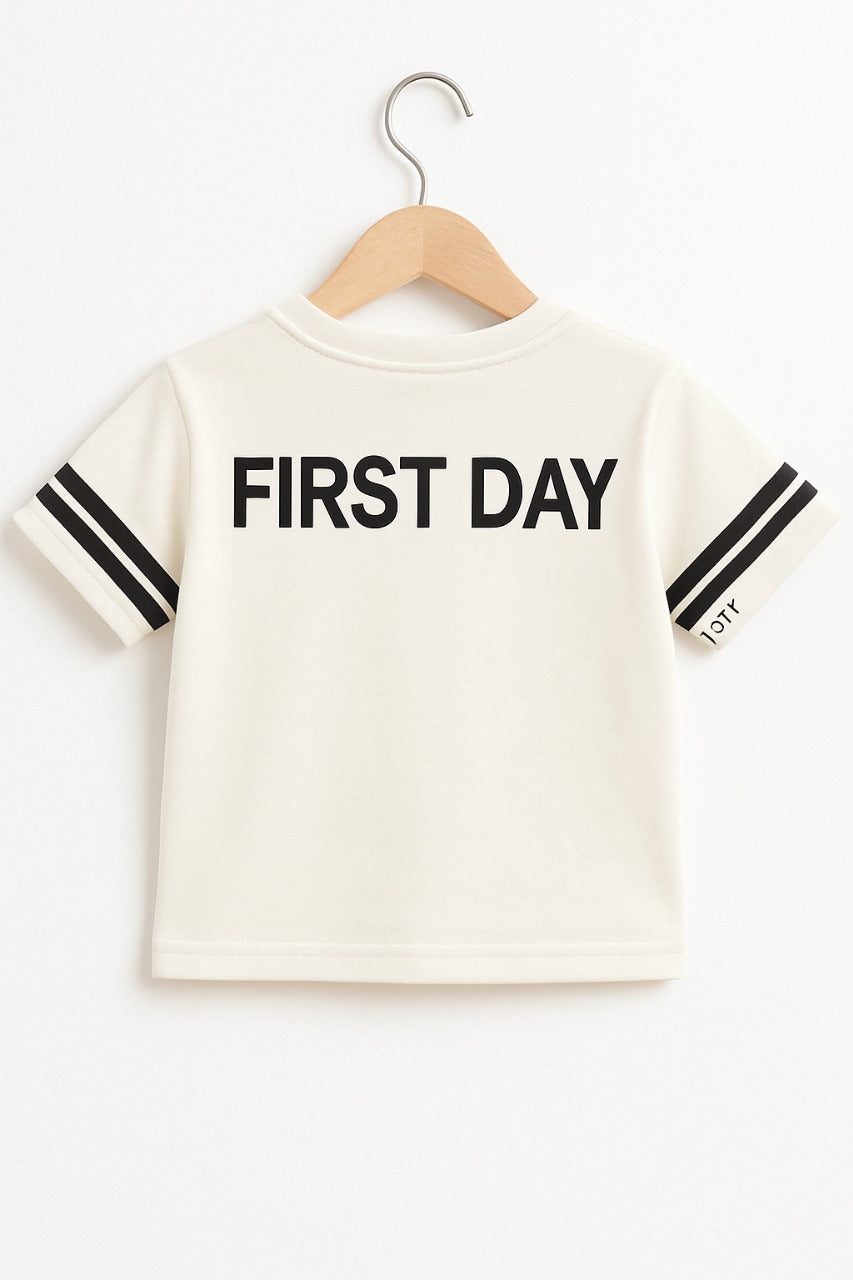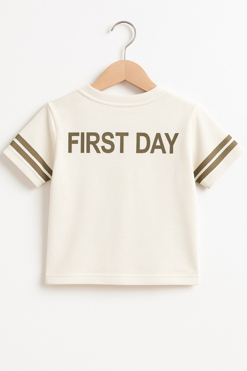 Make every milestone memorable in our Fantasy “First Day” Adventure Tee & Olive Cargo Shorts Set. This two-piece outfit pairs a crisp, off-white crewneck tee—featuring bold olive-toned “FANTASY” and “FIRST DAY” stripes on both front and back—with matching olive cargo-style shorts. Designed for comfort and style, it’s perfect for your little explorer’s first outings, playdates, or everyday adventures.