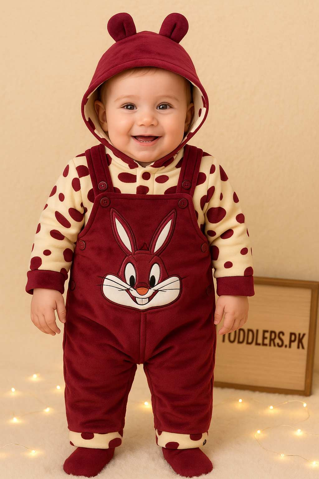 Dress your little one in style and comfort with this adorable 2-piece romper set. The dungaree features a playful cartoon embroidery on the front, paired with a soft striped inner shirt. Made with baby-friendly fabric, this outfit ensures comfort while keeping your child looking super cute. The hood comes with bear ears for an extra touch of charm, making it a perfect outfit for casual wear, outings, or photoshoots.