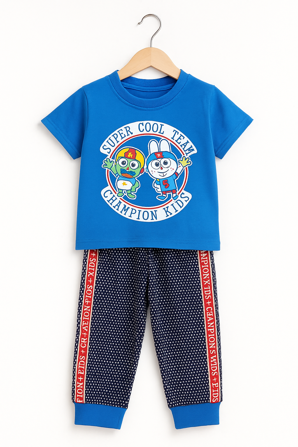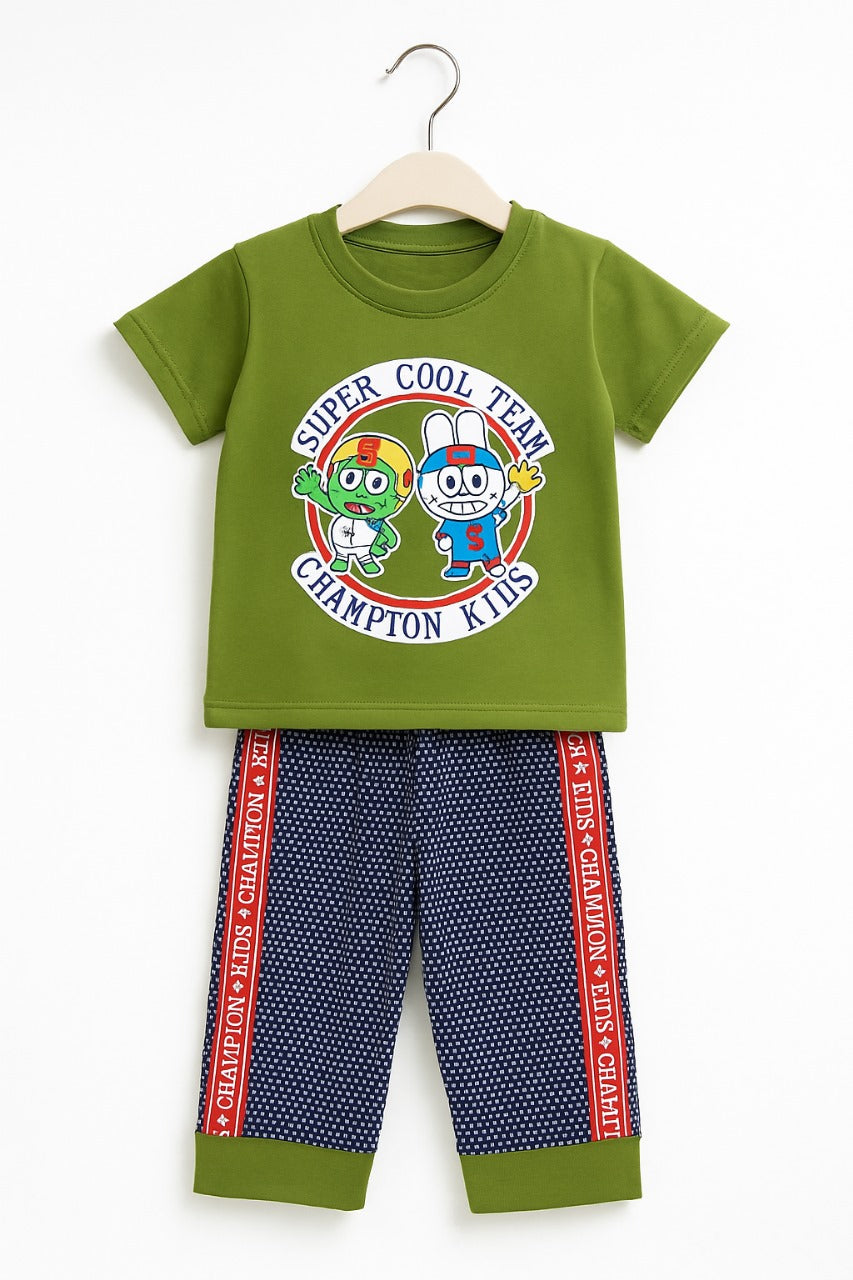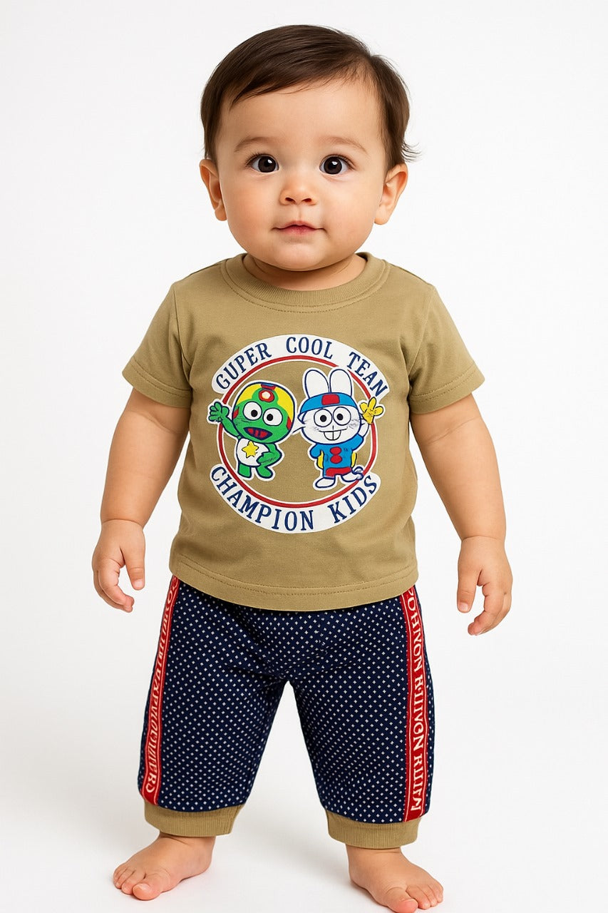 Turn everyday play into a mini victory lap with this spirited two‑piece set, featuring an olive‑khaki T‑shirt emblazoned with the colourful “Super Cool Team – Champion Kids” graphic and paired with navy polka‑dot knit shorts trimmed in bold red “Champion Kids” side tape. Soft, breathable cotton keeps your little champ cool, while the elastic waistband and ribbed cuffs ensure a comfy, stay‑put fit—perfect for park adventures, playdates, or that next adorable photo op.